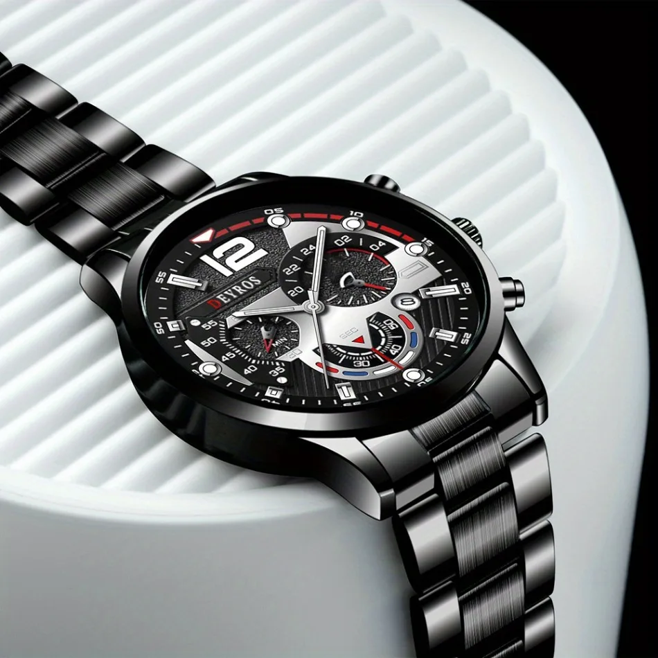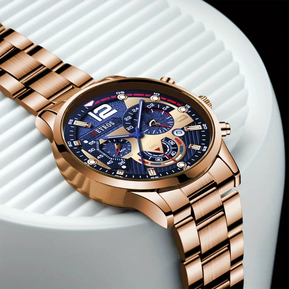 Design moderno com toque de sofisticação. O Relógio Deyros combina estilo fashion, mostrador completo e pulseira metálica leve. Ideal para quem valoriza elegância e conforto.