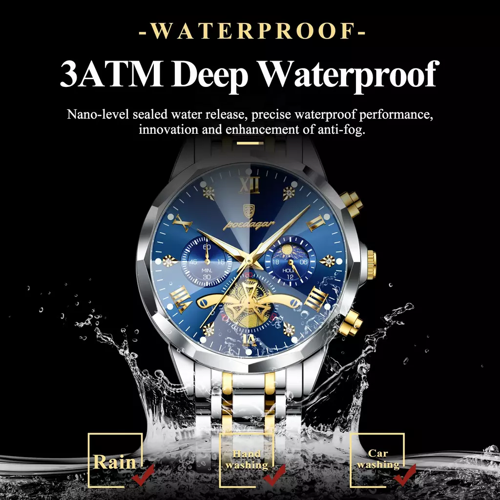 Elegância e precisão em cada detalhe. Relógio Poedagar de quartzo com mostrador luminoso e design premium em aço inoxidável. Sofisticação para qualquer ocasião.